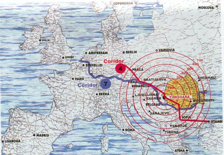 Timisoara befindet sich auf der grosse Nord-Sued-Route 4 (Dresden - Prag - Wien - Budapest - Bukarest - Thessaloniki - Istanbul) und ist ist ein Verkehrsnotenpunkt fuer die E70 (La Coruna - Lyon- Milano - Zagreb - Belgrad - Timisoara - Craiova - Bucuresti - Varna ) und E671 (Timisoara - Arad - Oradea - Debrecen), aber auch fuer das Eisenbahnnetz, so dass 9 Strecken beruehren sich hier, die wichstigsten waeren die Verbindungen mit Bukarest, Budapest und Belgrad.